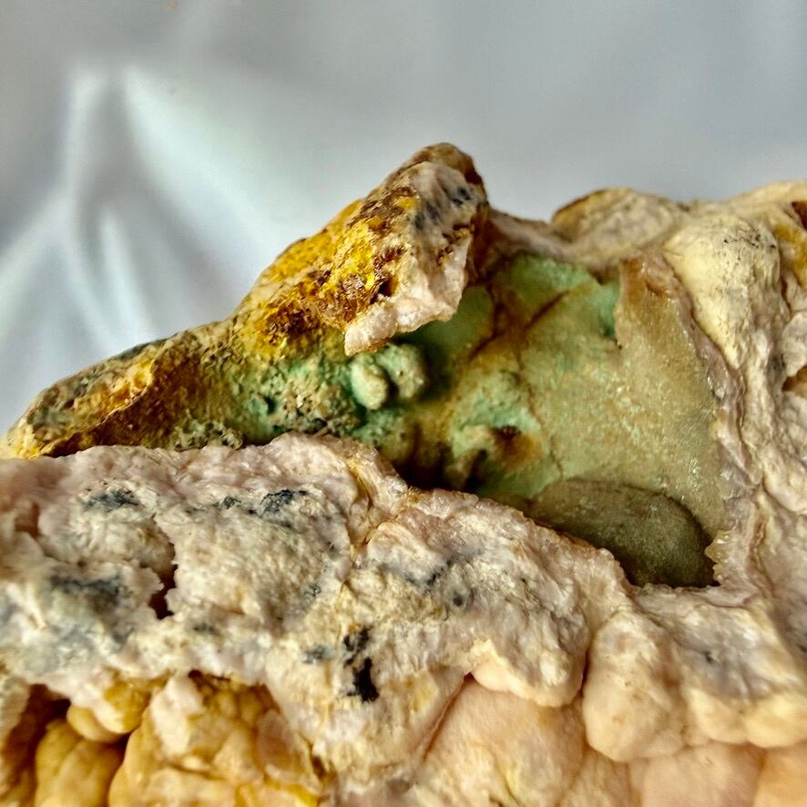 ※緑色に見える部分はマラカイト成分です。マラカイトが共生している珍しいインカローズになります