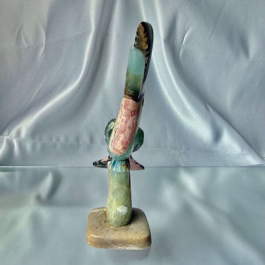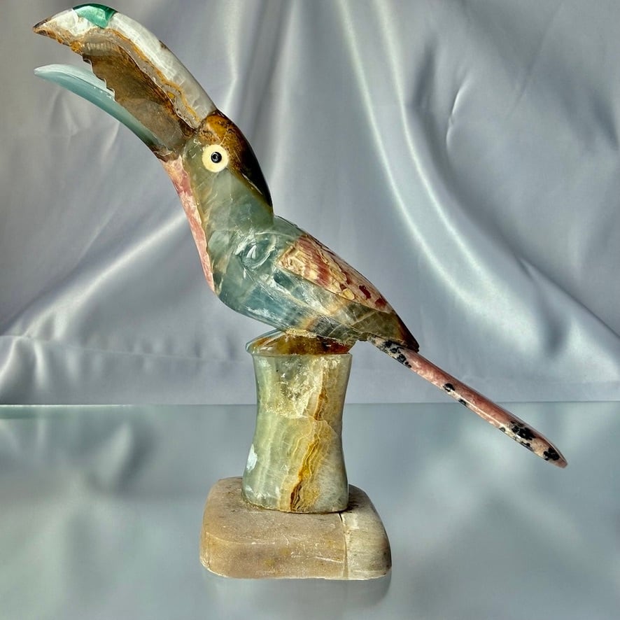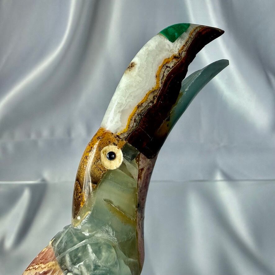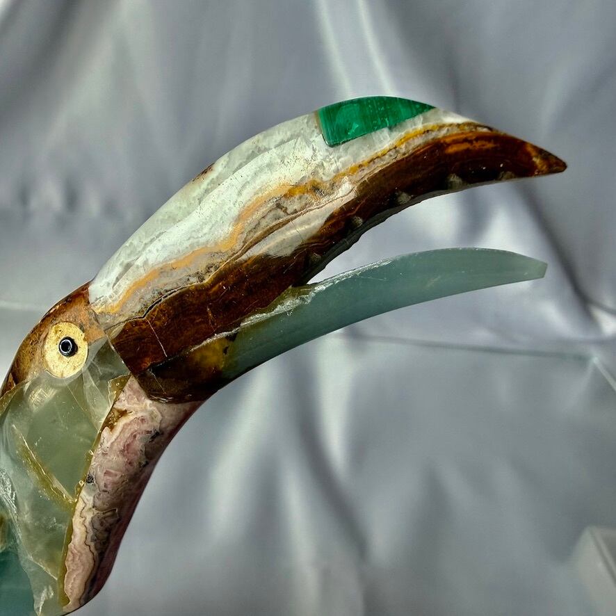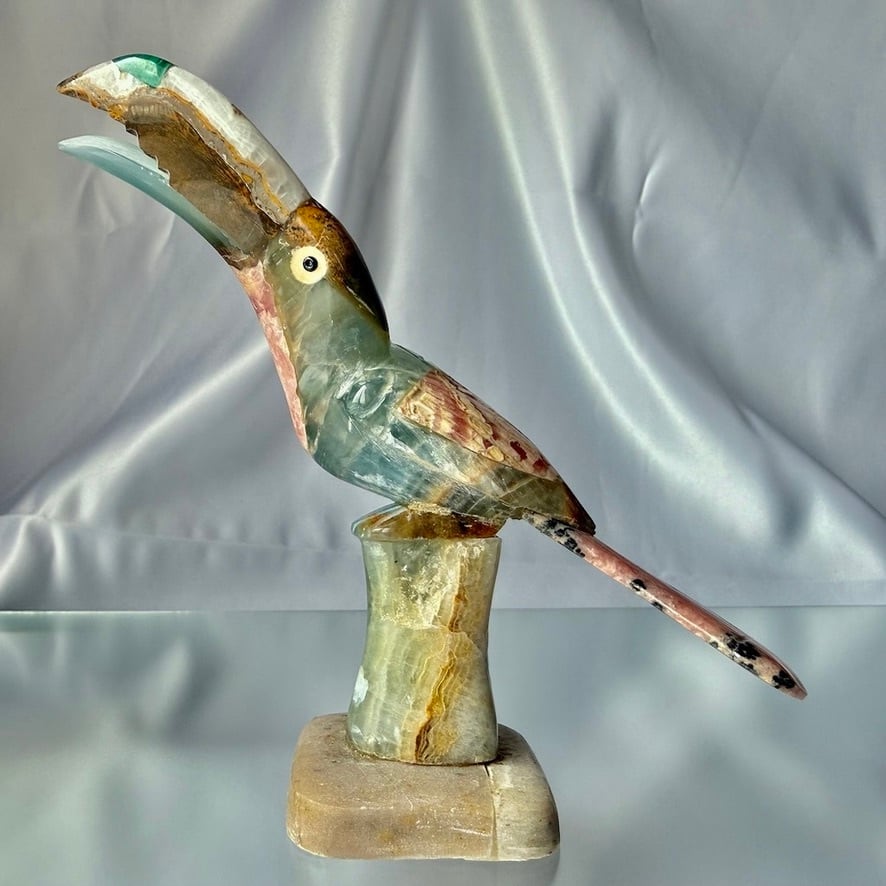 カルサイト、マラカイト、インカローズを組み合わせて作られた鳥(オニオオハシ)の置物です。アルゼンチン人の作家さんに作って頂いています。