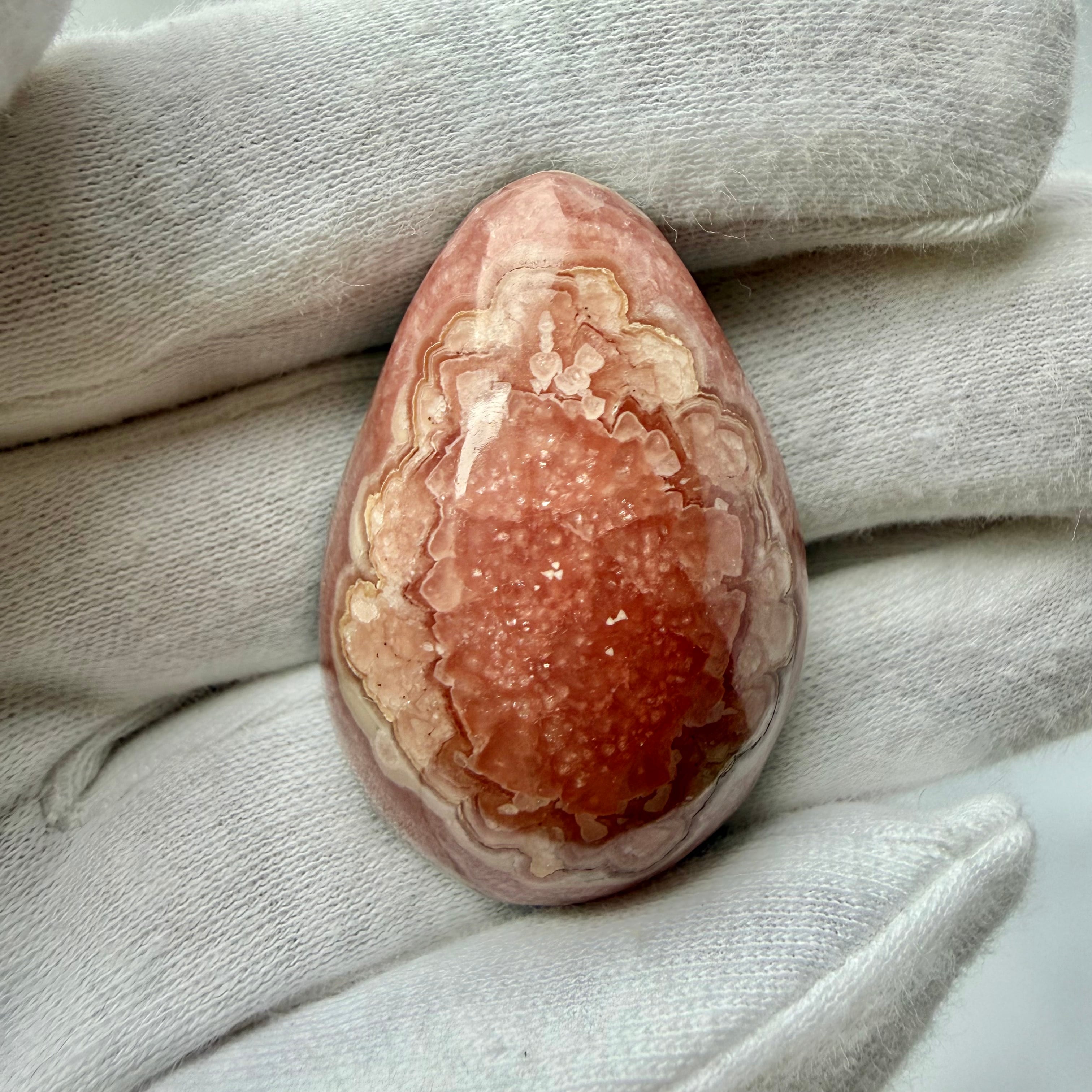 インカローズは、**「愛・情熱・癒やし」**のすべてを兼ね備えた、最強の愛の石と言われています。またインカローズは自己肯定感を高めたい方、人間関係を円滑にしたい方、新しい一歩を踏み出したい方のお守りとしても昔から世界で人気の天然石です。モース硬度が約4と柔らかく繊細な石ではありますが、ジュエリー加工用のルースとしても人気が高く、リング・ペンダント・勾玉など様々なアクセサリー制作にも最適です。アンデス山脈の大地が生み出したこの赤/ピンク色と白い縞が織りなす模様は一つとして同じものはありません。